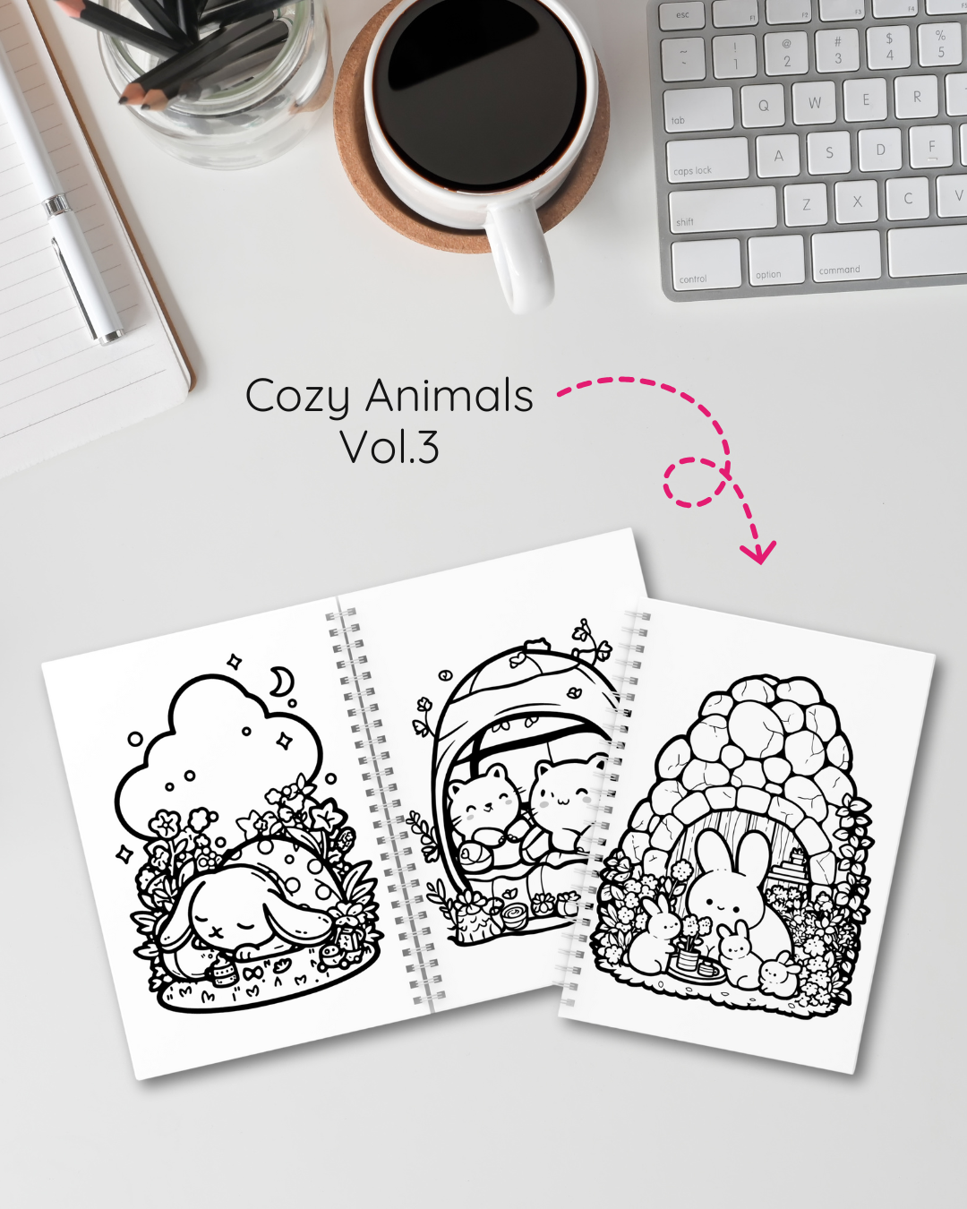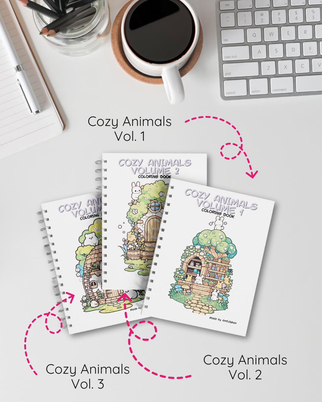 Son 3 volúmenes exclusivos en formato A5, cada uno con 30 hojas llenas de adorables ilustraciones, listas para cobrar vida con tus colores favoritos.